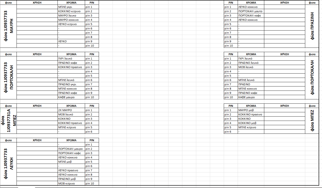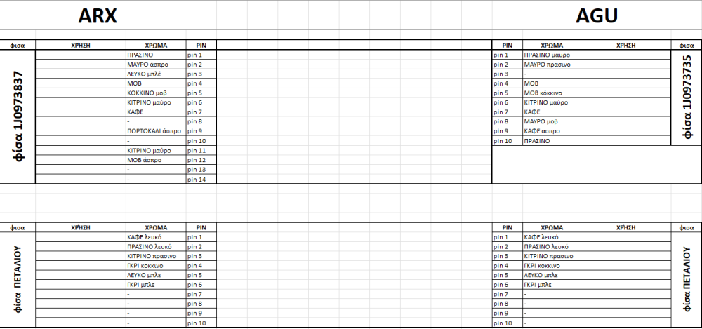 Καλημέρα, καλή εβδομάδα, καλές γιορτές και καλά μου ξεμπερδέματα... Όπως αναφέρω και στον τίτλο, πήραμε την απόφαση να αναβαθμίσουμε ένα GOLF τέταρτης γενιάς από ντιζάτο (AGU) σε ηλεκτρόγκαζο. Προμηθευτήκαμε: Πεταλούδα πετάλι γκαζιού Δύο λάμδα Δύο κνοκ MAF MAP Σετ πολλαπλασιαστές και φυσικά εγκέφαλο με την καλωδίωσή του. Έγινε όλη η εγκατάσταση και κάπου εδώ φτάνουμε στο σημείο όπου πρέπει να ενωθούν οι φίσες από την καλωδίωση του οχήματος, με την καινούρια. Το αυτοκίνητο έχει τρις φίσες στον νεροχύτη για την καμπίνα (ΠΡΑΣΙΝΗ, ΜΠΕΖ, ΠΟΡΤΟΚΑΛΙ) και μια φίσα δέκα πιν στο λούκι κάτω από το φιλτροκούτι. Η καλωδίωση του ηλεκτρόγκαζου είναι απο ARX κινητήρα (πιθανών από τετρακίνητο octavia) και έχει πέντε φίσες για την καμπίνα (ΜΠΛΕ για πετάλι, ΜΑΥΡΗ, ΠΟΡΤΟΚΑΛΙ, ΜΠΕΖ, ΛΕΥΚΗ) και μια δεκατεσσάρων πιν στο κανάλι κάτω από την μπαταριά. Υπάρχει κάποιος που να έχει κάνει αυτή την εργασία και να γνωρίζει με σιγουριά πως πρέπει να συνδεθούν οι φίσες? Νέο Φύλλο εργασίας του Microsoft Excel.xlsx