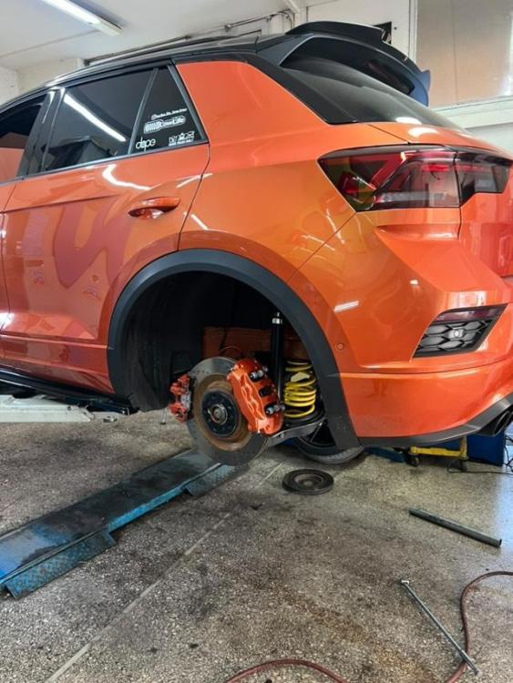 doggy Posted August 19, 2020 Report Posted August 19, 2020 Λίγο πολύ όλοι ξέρετε το VW Polo 6N που είχα στην Ελλάδα , το οποίο από το 2021 βρίσκεται μαζί μου στην Ολλανδία. Θέλοντας όμως και ένα λίγο πιο "καθημερινό" αυτοκίνητο για την Ολλανδία, πήρα ένα T-Roc. Ας παρουσιάσω και τον Μανταρίνη λοιπόν. Πρόκειται για ένα 2020 T-Roc 2.0 TSI, που καθώς έχω το μικρόβιο της βελτίωσης (γενικά), πέρασε και αυτό ήδη από μερικά στάδια βελτίωσης. Το αυτοκίνητο παρέμεινε "μαμά" για 1 εβδομάδα και κατόπιν έγιναν wrap με μαύρο gloss 3M vinyl όλες οι ασημί λεπτομέρειες (ράγες οροφής, ασημένιες ψεύτικες εξατμίσεις στον πίσω προφυλακτήρα, λογότυπα μπρος πίσω και πλαινά) και βαφή των δαγκάνων των φρένων σε πορτοκαλί gloss. Λίγο αργότερα έγιναν φιμέ τα πίσω φανάρια +3ο στοπ +ανακλαστήρες, τα DLR/φλας και μπήκε και φιμέ λωρίδα στο μπροστά τζάμι ψηλά, για να διευκολύνει στην οδήγηση. Ενδιάμεσα στις 2 επισκέψεις για το wrap έγινε ηλεκτροστατική βαφή στις Sebring 18" ζάντες, σε μαύρο gloss χρώμα και μπήκαν και τα γνήσια self-leveling καπάκια στις ζάντες με το καινούριο λογότυπο της VW. Τα παραπάνω ακολούθησε κατόπιν η αφαίρεση του πίσω wrap στο λογότυπο και η βαφή του σε μαύρο gloss με τα γεμίσματα στο χρώμα του αμαξώματος. Επιπλέον έγινε custom ο πίσω προφυλακτήρας με την αφαίρεση των ψεύτικων εξατμίσεων. Και έγινε ceramic coating σε όλο το αυτοκίνητο. Λίγο αργότερα μπήκαν ένα turbo muffler delete, ένα turbo intake 90 degree elbow και τα δύο της racingline και μπήκε πρόγραμμα 1ου σταδίου που μας έδωσε περίπου τα 260 άλογα (με 100άρα βενζίνη) και 430nm ροπής. Πίστευα πως τελείωσα αλλά ακόμη δεν μου καθόταν καλά στο μάτι. Οπότε οι 18" Sebring αλλάχθηκαν με DRC DGR ζάντες σε μαύρο gloss (Pretoria inspired) σε 19"x8.5 ET45 και με 235/40/19 Continental Sportcontact 6XL. Και τέλος, μπήκαν ελατήρια της Eibach, το Pro-Kit συγκεκριμένα, κρατώντας την μαμά ανάρτηση. Ο λόγος που δεν άλλαξα ανάρτηση γενικά είναι γιατί την στιγμή της αλλαγής το αυτοκίνητο είχε περι τα 6500χλμ μόνο. Μπήκε και μια custom cat-back (OPF/GPF back) εξάτμιση και πλέον θα περιμένω υπομονετικά μέχρι να λήξει η 4ετής εγγύηση πριν πάμε για bigger turbo κλπ. Πάρτε και μερικές φώτο από την αρχή μέχρι τώρα. ΟΕΜ: Wrapped: 18" Sebring painted: Tinted lights: Custom rear logo and rear bumper: 19" DRC DGR rims: Eibach springs installed: Valve exhaust installed: Και μερικά ξερόγκαζα με την βαλβίδα ανοιχτή και κλειστή: Και πως είναι τώρα (δείτε στα ποστ που είναι μέσα στις σελίδες του θέματος για τις ενδιάμεσες αλλαγές): Quote